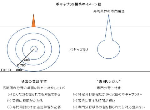 言い換えると、短い期間で成果を出すには、寿司関連用語の習得に全振りして、関係ない分野の単語は切り捨てる(後回しにする)という取捨選択が必要になってきます。しかしながら、それが寿司特化型バイリンガル(寿司リンガル)への最短ルートなのです。